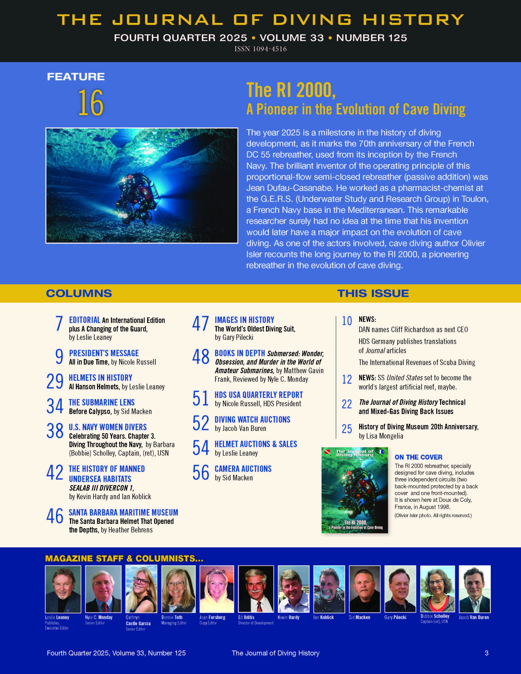 Journal of Diving History 125 To access this content, you must purchase Digital Membership, Individual Membership or Corporate Membership. 7 views Issue Fourth Quarter 2025 Volume 33 Number 125 Learn More Journal Details The Journal of Diving History is the official publication of the Historical Diving Society. In this issue To access this content, you must purchase Digital Membership, Individual Membership or Corporate Membership.